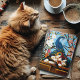 A calico cat lounges across a wooden tabletop, gently wrestling a fiery red Japanese dragon as if it were a favorite toy, blending playfulness with myth and imagination. Behind them, a brilliant stained glass peacock in jewel-toned feathers among blooming pink flowers, The artwork bursts with saturated color, intricate detail, and storybook charm, making it perfect for cat lovers, fantasy fans, and anyone who enjoys bold, decorative statement pieces filled with personality and magic.
