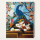 A calico cat lounges across a wooden tabletop, gently wrestling a fiery red Japanese dragon as if it were a favorite toy, blending playfulness with myth and imagination. Behind them, a brilliant stained glass peacock in jewel-toned feathers among blooming pink flowers, The artwork bursts with saturated color, intricate detail, and storybook charm, making it perfect for cat lovers, fantasy fans, and anyone who enjoys bold, decorative statement pieces filled with personality and magic.