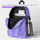 Adorned with a vibrant floral pattern, this backpack features stylized daisy-like flowers in full bloom, artistically scattered across a soothing lavender backdrop. The color palette is a monochromatic dream, with soft and deep purples that dance together to create a dynamic visual texture that’s both sophisticated and playful.