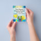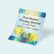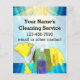 Personalize this colorful full-color promotional business product with your cleaning or janitorial company name and details. Features aqua and bright blue rays of light background with a yellow gloved hand holding feather duster, a green bucket with rag, and blue spray solution.