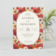 This vibrant wedding invitation features a lively floral pattern with rich reds, oranges, and creams, creating an energetic yet elegant atmosphere. The central oval frame elegantly displays the text in a classic serif font, adding a touch of sophistication to the design. Perfect for a spring or summer celebration, this invitation exudes warmth and joy, inviting guests to partake in a memorable occasion filled with dinner and dancing. Its customizable layout allows you to personalize it for your special day, ensuring every detail reflects your unique style.