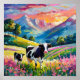A heartwarming modern impressionist painting of a mother cow and her calf in a serene rural mountain pasture, brought to life with bright, vibrant colors and thick abstract brushstrokes. The dynamic strokes capture the peaceful bond between the animals, while the rich hues of green, blue, and earthy tones create a lively, pastoral scene. This expressive artwork beautifully blends nature and tenderness, perfect for adding warmth and character to any space.