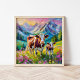 A heartwarming modern impressionist painting of a mother cow and her calf in a serene rural mountain pasture, brought to life with bright, vibrant colors and thick abstract brushstrokes. The dynamic strokes capture the peaceful bond between the animals, while the rich hues of green, blue, and earthy tones create a lively, pastoral scene. This expressive artwork beautifully blends nature and tenderness, perfect for adding warmth and character to any space.