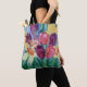 A vibrant painting in inks of purple tulips and golden daffodils by Miranda Phythian-Adams. Carry a bit of springtime joy on your shoulder!