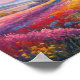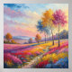 An enchanting landscape painting bursting with the joyful colors of spring. Rolling hills are adorned with a tapestry of blooming wildflowers in shades of fuchsia, lavender, gold, and cerulean. A gentle path winds through the vibrant flora, leading the eye towards a line of graceful trees with foliage painted in brilliant hues of yellow, blue, and pink. The sky above is a spectacle of soft pastels, with wisps of clouds bathed in the warm glow of dawn or dusk, creating a serene yet lively atmosphere. This artwork captures the essence of a dreamlike springtime, inviting viewers to immerse themselves in its beauty and tranquility.