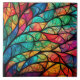 A mesmerizing stained-glass-inspired abstract design featuring intricate leaf-like patterns in a spectrum of rich, glowing colors. The interplay of reds, blues, greens, and yellows creates a dynamic and harmonious composition, reminiscent of a radiant autumn tree or a kaleidoscopic mosaic. Perfect for decorative ceramic tiles, trivets, or artistic prints to bring elegance and energy to any space.