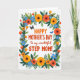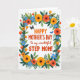 This card features a bright digital illustration with a white background and a lush floral frame that feels like a garden hug ❤️. Centered on the page, the message reads “HAPPY MOTHER’S DAY to my wonderful STEP MOM!” with “HAPPY MOTHER’S DAY” in orange, all-caps lettering and “to my wonderful STEP MOM!” in a flowing orange style beneath it. Around the text, golden-yellow flowers with dark centers mingle with coral-orange blooms and small sky-blue petals, creating a sweet, affectionate surround that draws the eye inward. Deep green leaves and thin, dark stems weave through the border, giving the arrangement a full, lively look. Two small striped flying insects tuck into the foliage as if they’ve drifted in together on a warm day 🌼. Near the top corners, one black butterfly and one soft blue butterfly add a gentle fluttering motion to the frame. The flowers cluster most densely along the edges, leaving an open white space around the centered orange message.