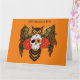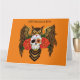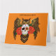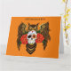 This bold sugar skull owl design blends Día de los Muertos symbolism with striking gothic style. A detailed brown owl with outstretched wings frames a decorative sugar skull adorned with colorful floral accents, a diamond motif, and vibrant red roses. Set against a rich orange background, this artwork captures a dramatic mix of wisdom, mystery, and romantic gothic beauty.