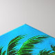 Colorful tropical seascape featuring a vibrant sunset, crashing ocean waves, and palm-lined serene sandy beach. Artistic depiction captures the tranquil and scenic beauty of nature's vivid hues and paradise landscapes.