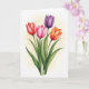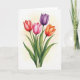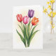 Designed with four closed tulip-like blossoms centered on a softly lit, creamy background, this card keeps the focus on springtime color and gentle closeness ❤️. A deep purple bloom, a rich red bloom, a blush pink bloom, and a warm orange-red bloom stand upright like friends gathered side by side. Slender green stems rise from broad green leaves that overlap slightly, as if leaning in toward one another in a quiet, affectionate cluster. Smooth shading along the petals gives each flower a rounded, touchable look, suggesting they’re about to open. The background glow stays subtle and warm, letting the flowers feel like they’re sharing the spotlight without competing. A short Mother’s Day greeting sits near the top in a soft, darker tone, with a smaller line of text near the bottom in matching color, leaving plenty of open space 🌼. Fine highlights trace the petal edges, and the leaves show gentle veins in muted green.