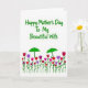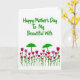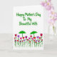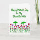 Designed with a bright white background, this card centers on a large green message that reads “Happy Mother’s Day To My Beautiful Wife,” filling the upper two-thirds of the front. The lettering looks smooth and flowing, with the words stacked in neat lines so the greeting feels front and center. Below the text, a wide horizontal strip of spring flowers stretches across the bottom, like a shared garden moment between partners ❤️. The blossoms resemble tulips with cup-shaped tops in crimson, magenta, and lavender, each rising on slim green stems. Tucked among the flowers are two rounded green umbrellas, angled slightly as if two people are leaning close under them. The simple flat shapes and unshaded color areas keep everything easy to read while still feeling warm and affectionate 🌼. The bottom band is packed with flowers and the two green umbrellas, all set against the same white space above.