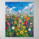 This vibrant painting depicts a field of wildflowers under a bright blue sky. Featuring daisies, poppies, and other blooms in shades of orange, pink, red, blue, and white, the artwork captures a lush, lively scene. The clear sky with fluffy white clouds adds depth, while the impressionistic style with bold brushstrokes and vivid colors evokes a cheerful, sunny day. Perfect for brightening up any room with a touch of nature.