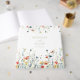 This design features a border of vibrant wildflowers in shades of red, yellow, green, teal, and blue. Perfect for casual summer weddings.