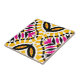 This decorative ceramic tile is a stunning work of art that will add a touch of elegance to any room. The intricate geometric pattern is symmetrical and features a vibrant combination of yellow, black, white, and pink colors. The glossy finish and white border give the tile a refined look, while the shapes of triangles, diamonds, and circles create a visually captivating design. This tile is perfect for adding a pop of color and interest to any space.