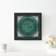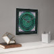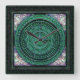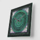 An ornately wooden framed baroque clock embellished with birds, flowers and plants. The clock is in the center of the frame, has a metal look and is very detailed and decorative and done in green color with blue numbers and a touch of purple.