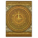 An ornately wooden framed baroque clock embellished with birds, flowers and plants in green and pink.. The frame has a burnished gold leaf look. The clock is in the center of the frame, has a metal look in brass and is very detailed and decorative with gold numbers.