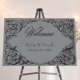 Elevate your gothic wedding with a Victorian-inspired wedding welcome sign that exudes timeless elegance and mystery. Designed to resemble an antique book binding, this stunning design features intricate a black and gray lacey filigree, evoking the charm of a bygone era. Let your love story unfold with an invitation as unforgettable as your day. Created by Simply Farmhouse Press.