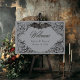 Elevate your gothic wedding with a Victorian-inspired wedding welcome sign that exudes timeless elegance and mystery. Designed to resemble an antique book binding, this stunning design features intricate a black and gray lacey filigree, evoking the charm of a bygone era. A bat with its wings spread sits at the top. Let your love story unfold with an invitation as unforgettable as your day. Created by Simply Farmhouse Press.