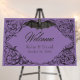 Elevate your gothic wedding with a Victorian-inspired wedding welcome sign that exudes timeless elegance and mystery. Designed to resemble an antique book binding, this stunning design features intricate a black and purple lacey filigree, evoking the charm of a bygone era. A bat with its wings spread sits at the top. Let your love story unfold with an invitation as unforgettable as your day. Created by Simply Farmhouse Press.