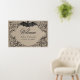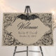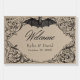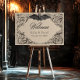 Elevate your gothic wedding with a Victorian-inspired wedding welcome sign that exudes timeless elegance and mystery. Designed to resemble an antique book binding, this stunning design features intricate black lacey filigree on a tan brown kraft paper-looking background, evoking the charm of a bygone era. A bat with its wings spread sits at the top. Let your love story unfold with an invitation as unforgettable as your day. Created by Simply Farmhouse Press.