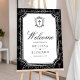 Elegant catholic wedding welcome sign featuring beautiful victorian crest with intricate details.
