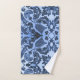Victorian pattern on towels in blue. Wash cloth and bath towel have the matching pattern in different sizes. The hand towel has a reverse of that pattern.