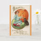 A Victorian Boy is carving a huge jack-o-lantern while his black cat is sitting nearby. Image of a Vintage Postcard on vivid orange background.
