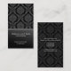 A black and grey damask pattern serves as a wallpaper for this card while a rich black panel holds your business information. The pattern is repeated on the back in a darker shade to show off your address, phone and web information. Available in alternate colors.
