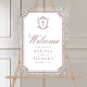 Elegant catholic wedding welcome sign featuring beautiful victorian crest with intricate details.