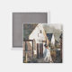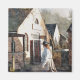 Life in Victorian times, a Victorian working class girl, small industrial factories and smoke filled skies. Watercolor.
