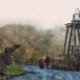A watercolor of a Victorian couple walking past the mine wheel on a cold winter day.