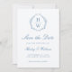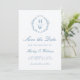 This elegant wedding Save the Date card features the couple's monogram initials in blue serif font, encircled by a hand-drawn blue floral wreath. The words "Save the Date" appear in formal blue script. Add the couple's names, the wedding date and the venue below. The back of the card features a delicate blue floral pattern on a white background.