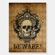 This haunting Vintage Halloween sign warns party guests to beware. The design features an ornate frame with a skull design in the center on a brown diamond pattern background.