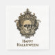These haunting Vintage Halloween napkins features an ornate frame with a skull design in the center on a brown damask background. The words "Happy Halloween" are spelled out in a pirate font.