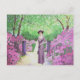 Beautiful vintage style postcard. An elegant Victorian Lady, standing in a vibrant Rhododendron garden.