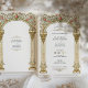 This elegant Victorian wedding invitation features a grand gold arch adorned with climbing vines of pink roses and delicate greenery. The intricate floral details and classic column design exude timeless sophistication and romantic charm. Perfect for couples seeking vintage-inspired wedding stationery with a luxurious aesthetic and a touch of floral elegance.