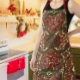 Great color and even though I ordered the kid size, it covers well enough to use during the holidays. I am not a big woman and prefer a shorter apron. I stand 5"6" and the length of the garment goes to mid-thigh. The tie straps fit well at my waist and even though there is no neck strap adjustment, the opening is plenty big enough. I am happy with the size and fit. I am sharing my apron with my 10 year old grandson, too! The color is vibrant and looks good, as shown on the website. The stitching looks strong and reinforced. Photographed is front side and back side of the apron, reinforced straps and coloring. My phone camera may not be the best at showing the details.