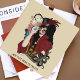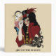 A black haired woman all in red victorian steampunk attire. Black tribal octopus, clock, blue butterfly and pink rose