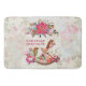 A charming christmas bath mat. The background is a vintage style collage with a faded image of pink roses, green leaves and french writing. Layered over top