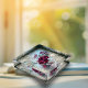 Lovely, vintage, red rose florals on newspaper print, featuring a faux pearl brooch and necklace, birdcage with teal bow to create a luxury, extravagant, elegant, vintage chic style.