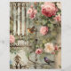 A charming Victorian-style scrapbook paper presenting a serene garden scene, with blooming roses and birds perched on intricate iron gates, exuding a sense of tranquility and nature's beauty.