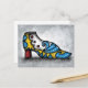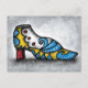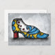 Victorian Shoe features a fanciful and colorful vintage shoe. In primary colors of red, yellow and blue with white dots for trim and a grey background.