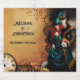 A warm orange-brown backdrop sets the tone for this steampunk wedding design, featuring a vintage clock, gears, and brown line art. At the center, a Victorian couple—dressed in their finest steampunk attire