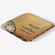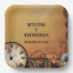 A warm orange-brown backdrop sets the tone for this steampunk wedding design, featuring a vintage clock, gears, and brown line art. At the center, a Victorian couple—dressed in their finest steampunk attire