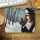 A captivating steampunk-inspired portrait set in a haunting winter landscape. A mysterious Victorian woman with flowing red hair stands among stark, leafless trees and drifting snow, her piercing gaze as cold as the season around her. Dressed in elegant black attire with a feathered top hat, she gently holds a mechanical dragonfly perched on her gloved hand, while a vintage key dangles like a secret waiting to be unlocked. This artwork blends gothic elegance, steampunk fantasy, and winter solitude, making it perfect for lovers of dark beauty, alternative fashion, and imaginative storytelling.