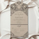 Elevate your gothic wedding with a Victorian-inspired all in one wedding invitation with dinner choices that exudes timeless elegance and mystery. Designed to resemble an antique book binding, this stunning design features intricate a black lacey filigree on a tan kraft paper-look background, evoking the charm of a bygone era. The wording, "Til Death Do Us Part" can be edited and changed, or deleted entirely, if you prefer. Let your love story unfold with an invitation as unforgettable as your day. Created by Simply Farmhouse Press.