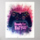 Video game console Controller Ready for Battle- A black console controller is depicted in a vibrant, stylized design. The controller is positioned front and center, with a pink and purple color scheme dominating the background. The background features a circular pattern of radiating lines, reminiscent of a sunburst, with splashes of color creating a dynamic and energetic feel.