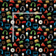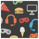 Video Game Party Kids Gamer Snacks Pattern Fabric. Video game controllers, headphones, pizza, donuts, burgers, icecream and fries pattern on black background. Fun gamer video game party pattern for kids. www.SamAnnDesigns.com