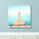 An illustration of Vieste lighthouse in Italy. This lighthouse is drawn standing on its Rocky Island. The theme of the lighthouse is lighting up the dawn or dusk sky. It is also known as Isola Santa Eufemia. It is located between the rocks of Santa Croce and San Francesco, just opposite the town of Vieste, Apulia,