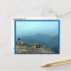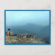 A hiker has climbed to a rocky outcrop on Mt. Crawford in the White Mountains of New Hampshire. She can see misty blue mountains and wilderness for miles and miles. This fine art photography postcard captures the wonder, magnificence and exhilaration of mountain climbing.